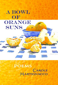 "From tangerines to monkish robes, daylilies to Agent Orange, Carole Martignacco’s poems are drenched in colour. The blazing vibrancy of her images allows her searching, curious spirit to take flight. A Bowl of Orange Suns is a constant pleasure – a poetry collection infused by the light of the physical world as well as the luminous grace of mind and heart."